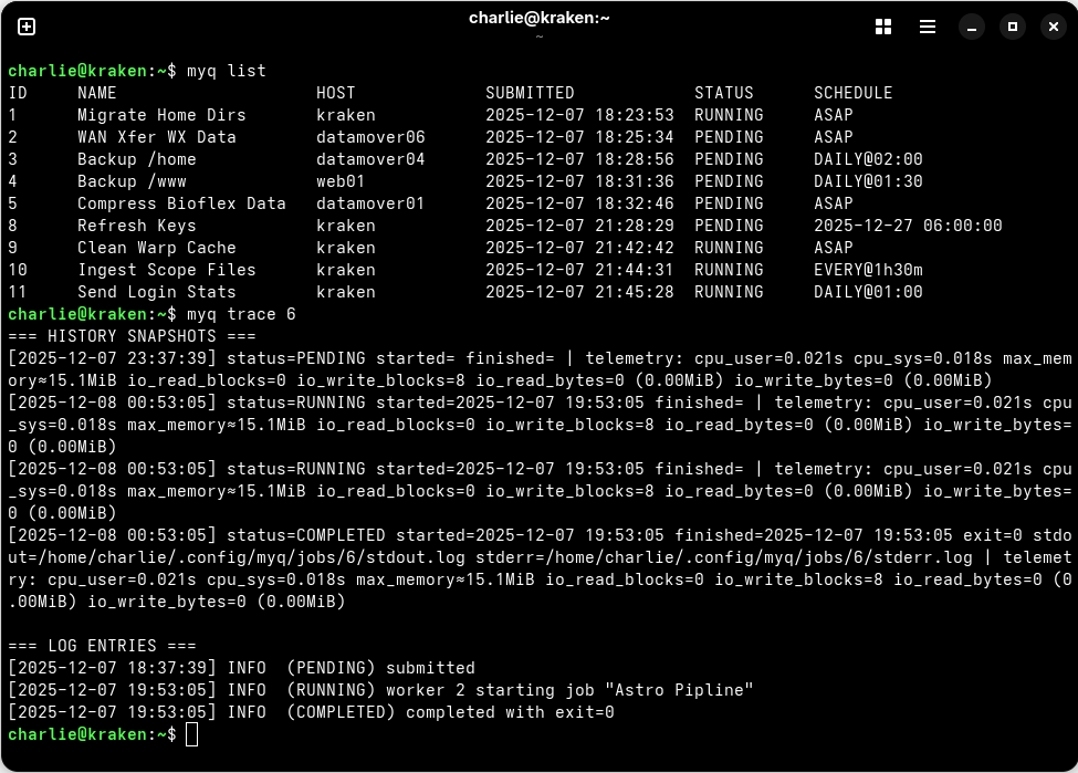 MyQ is a terminal-based personal job scheduler for individual users. It takes inspiration from tools like Slurm, PBS, Cron and At. If you are familiar with those tools, then using MyQ should be intuitive.